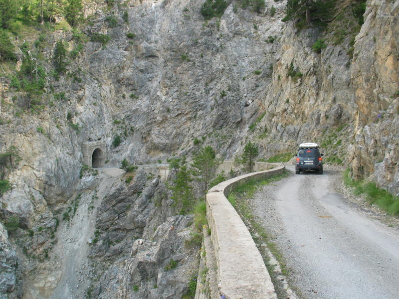 vlevo je sráz do údolí. Cesta je zde vytesaná ve skále, a ještě nedávno byla jen těžko průjezdná pro nízký profil, takže vyšší
